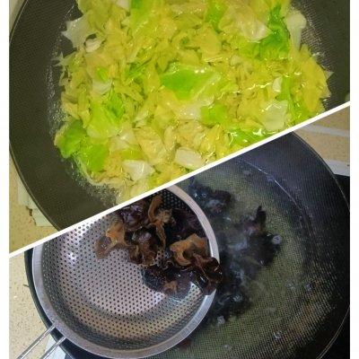 3、坐锅烧水,圆白菜焯水30秒,捞出过冷水 黑木耳焯水5分钟,捞出过冷水