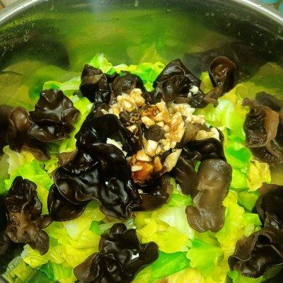 2、圆白菜手撕成小块用盐水浸泡(去除农药残留杀菌) 黑木耳开水浸泡15钟 大蒜切成蒜末