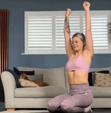 金刚座准备,吸气,双手向上伸直呼气,重复做握拳/松开动作30次动作04