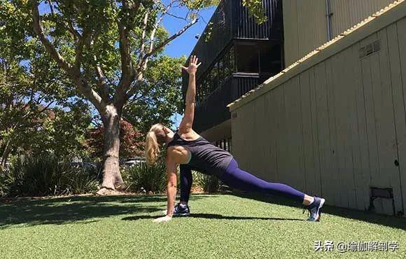 斜板式进入,抬左腿向上左腿与髋同高,伸直左手臂向前右手和左腿向两端延长核心收紧,脖颈放松保持5-8个呼吸,换另一侧11、侧板式