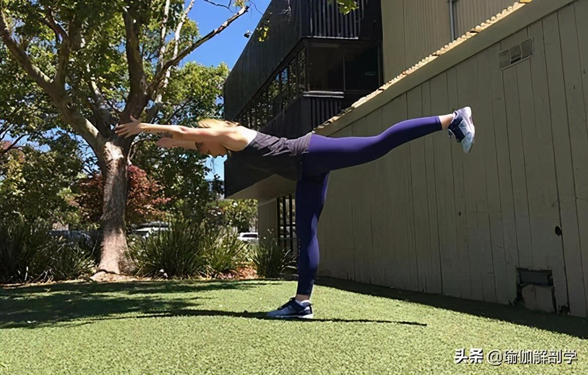 侧角扭转进入战士三式抬左腿向上至与髋同高双手伸直在耳朵旁侧双手、身体、左腿一条直线保持5-8个呼吸6、站立单腿头触膝