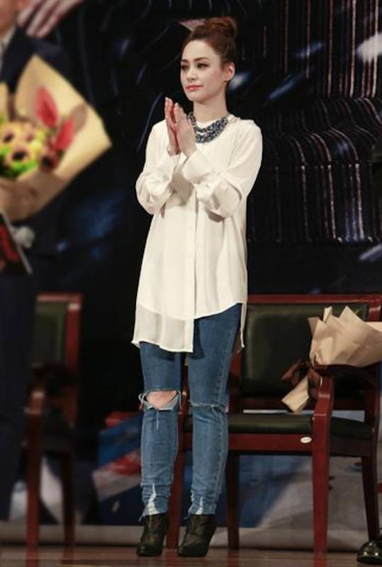 紧身破洞牛仔裤就更加来者不善了,小腿粗加上不够修长就会看起来更加矮胖,高跟鞋虽然是改良的好办法,可惜阿娇并没找到合适的鞋。