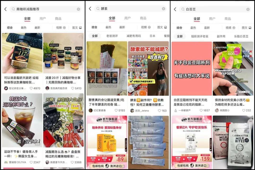 而健身美体赛道一直火爆的小红书就更不用提,现在去平台上搜索白芸豆,有3W+篇笔记,400+相关商品;关于瘦身,更是有超过74W篇笔记记录着各个用户的“减肥心得”。