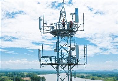 安徽省铜陵市义安区胥坝乡一座5G基站铁塔上,工作人员在调测天线。