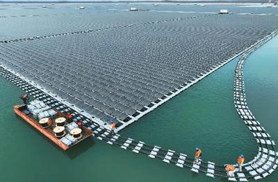 近日在能源集团山东电力有限公司聊城发电运营分公司循环水水库漂浮式光伏发电项目建设现场,工人进行组件铺设的后安装。