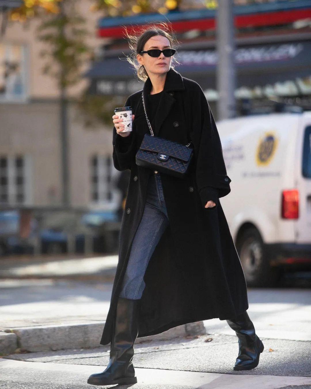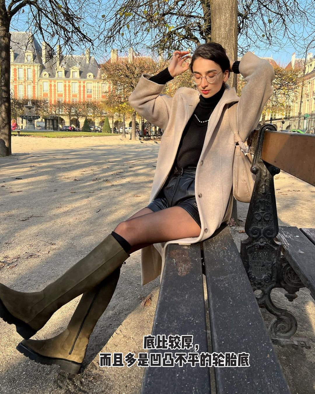 太厚的底除了容易拉低重心,显得人不够轻盈外,还特别重。我之前试过一双底厚点的,是真·负重前行。纽约博主Claire Rose这双靴子也挺考验人的。▼