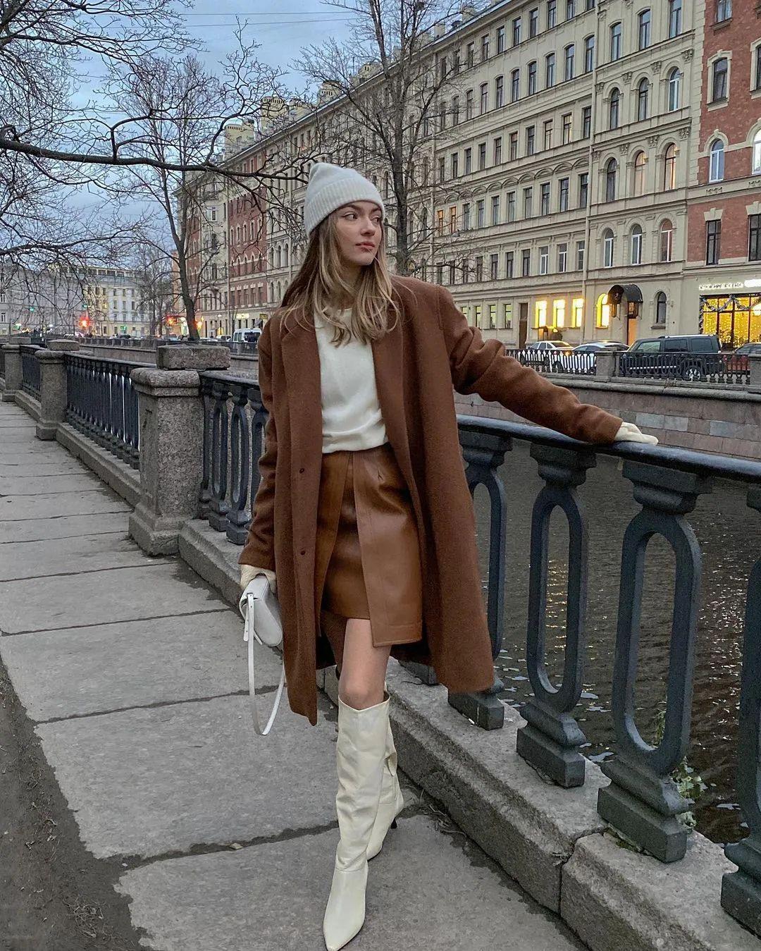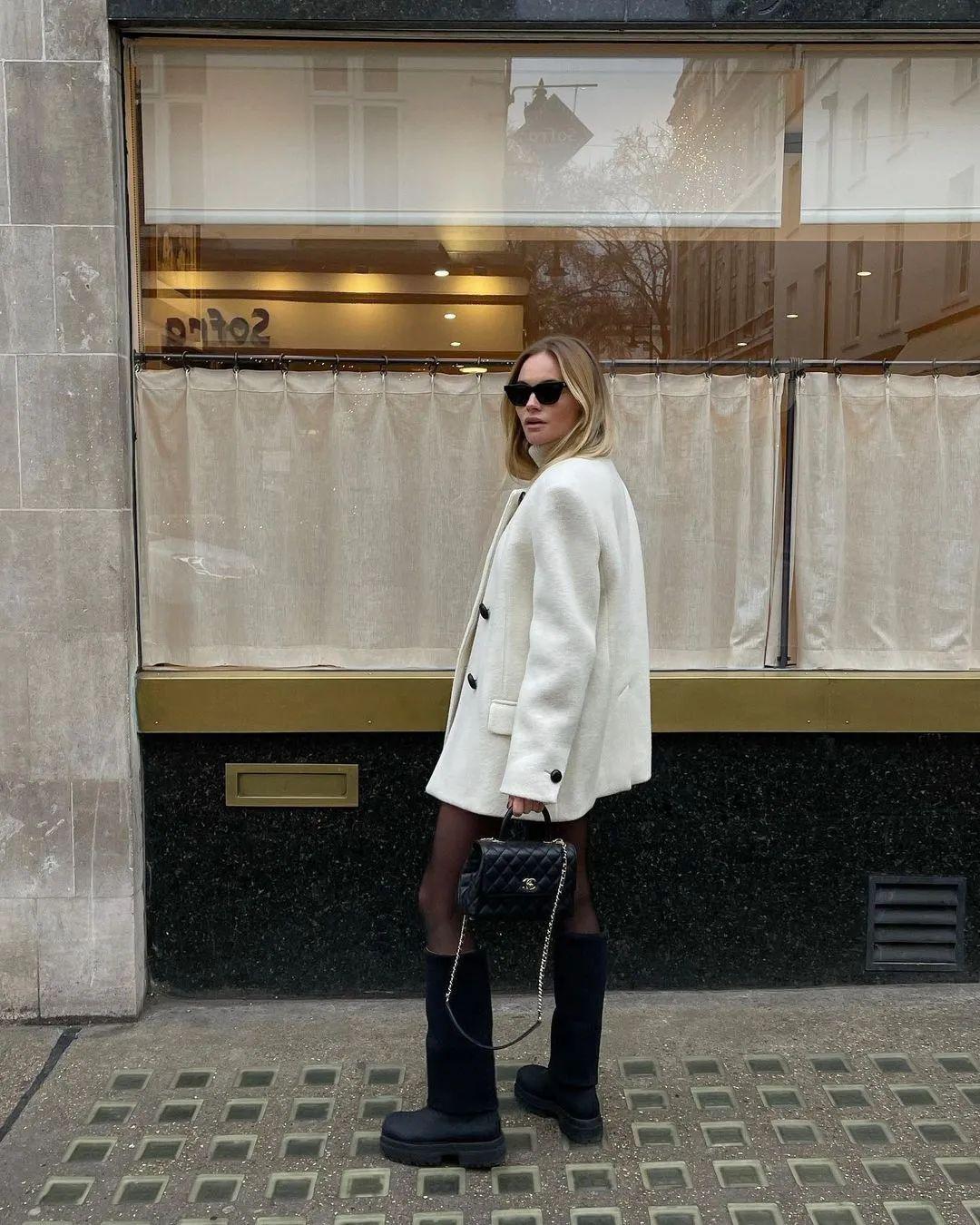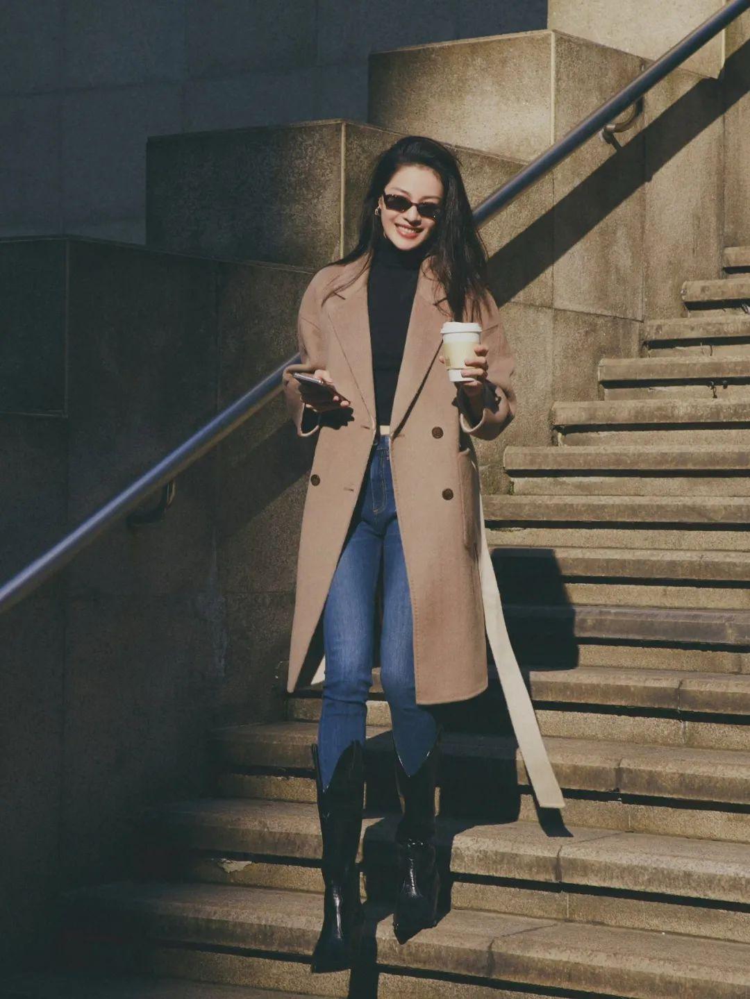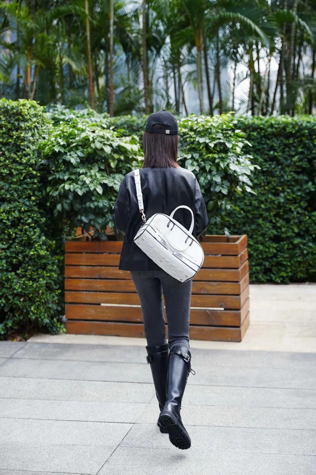 白色、米色长筒靴今年比较火,在街拍里挺常见的,试穿后发现并没有想象中难搭。一般搭牛仔单品或者同色系单品都可以。▼