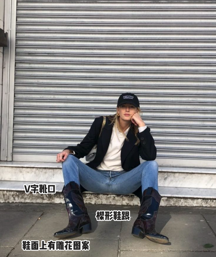 它的特点鲜明,常见的是这种V字靴筒+楔形鞋跟(一般是2-5cm)的,很多鞋面上还有低调的雕花图案。▼