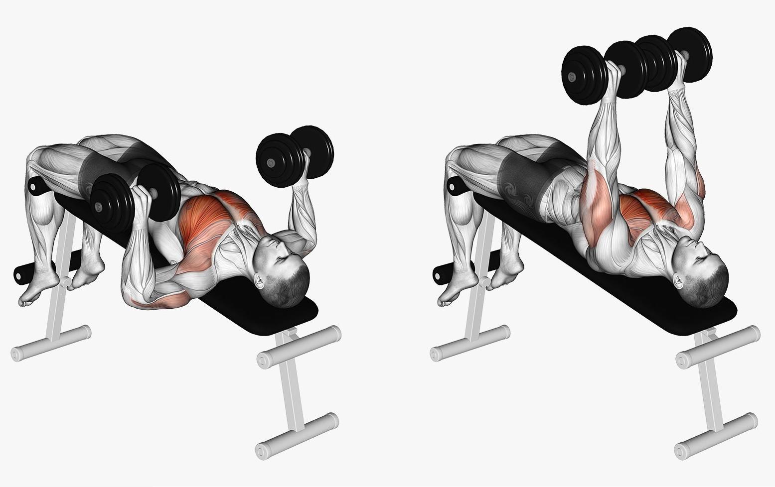 动作要领:躺在向下倾角约30度到45度角下斜凳上,臀部在整个过程中保持与凳子接触,不要离开凳子。双脚打开与肩同宽放在地板上,并用力将双脚踩入地板,使股四头肌弯曲,这样会使你整个身体保持紧绷,但要不使臀部离开凳子。肩胛骨下沉后收,绷紧核心。双手掌心相对握住哑铃并把哑铃推起置于胸部正上方,这是起始姿势。不要完全伸直双臂并将其锁定,然后手臂将哑铃向两侧以弧度降低,直到感觉到胸部拉伸但不要过度拉伸,避免伤害肩关节。胸部发力将手臂向上夹,回到起始姿势,整个过程肘部保持轻微弯曲。