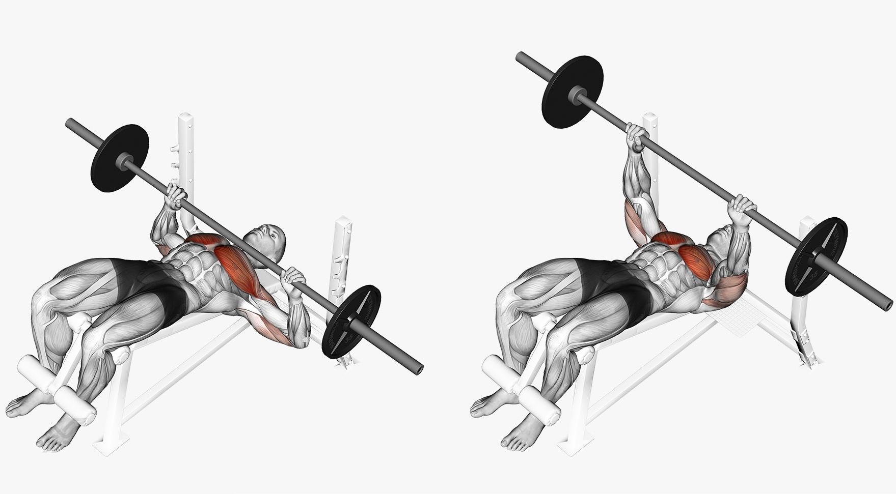 动作一:下斜杠铃卧推:
