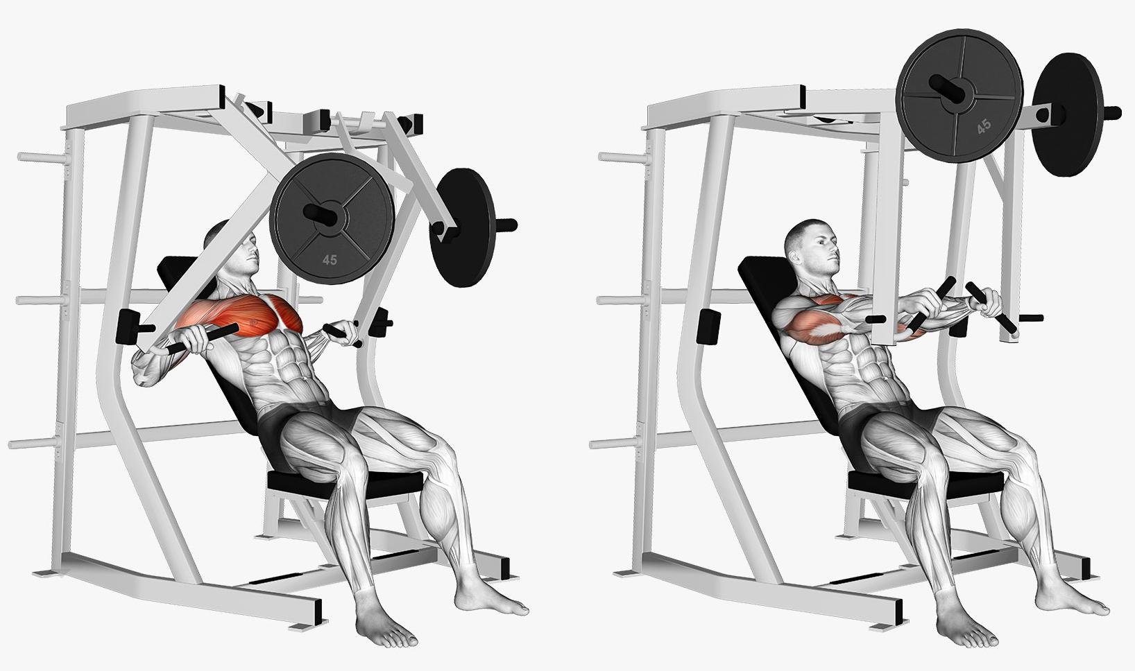 动作要领:调整座椅高度,如果想要训练胸肌下沿,在开始训练之前,要把座椅高度调整一下,让握把的高度和我们胸部下沿的高度一致。调整好重量,坐在器械的坐垫上,紧贴靠背使头部、上背部和臀部都要和后面的靠背紧紧贴合,绷紧核心,这是起始姿势。双手握紧握把,胸部发力把重量向下推出。当推到低点的时候,要注意手肘不要完全伸直,以免损伤关节,并且挤压胸肌。在胸部的控制下缓慢下放至起始姿势。