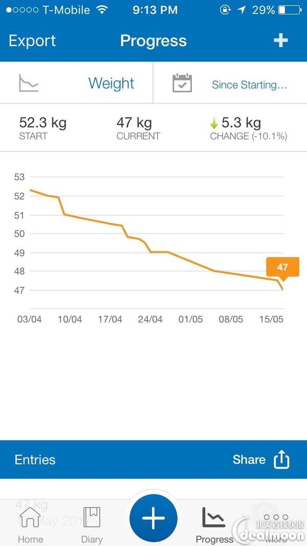 先来张图镇楼!从4月3号正式减肥开始到今天,一个半月,我瘦了10.6斤!所有体重都是在晚饭后测量的,所以不存在一天之内体重差异~~ 我终目标是90斤(不要觉得这个体重太瘦了,因为我个子矮?),我其实并不像练出多么漂亮的线条,自己也知道,就凭我这个大胃王和各种禁不住诱惑,我肯定不会像晒货区里那些疯狂健身的妹子那么苗条和有漂亮的肌肉,我个人也不想要特别发达的肌肉,只是单纯的想瘦一点,但不是瘦那种,就是有点肉肉(手感好),但是穿衣服也不会显胖那种~~
