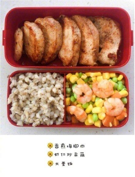 香煎鸡胸肉+虾仁炒杂蔬+大麦饭