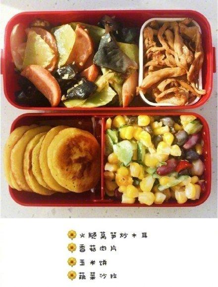 火腿莴笋炒木耳+香菇肉片+玉米饼+蔬菜沙拉
