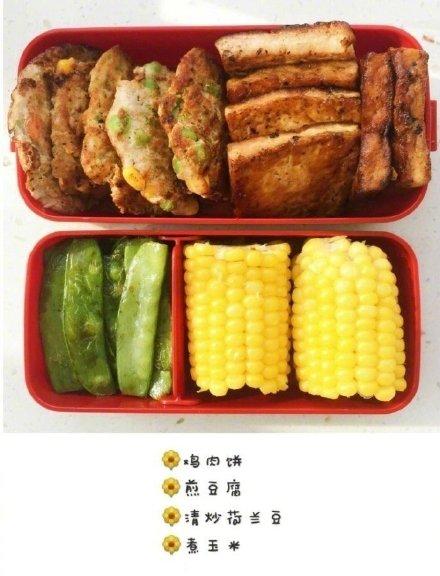 鸡肉饼+煎豆腐+清炒荷兰豆+煮玉米