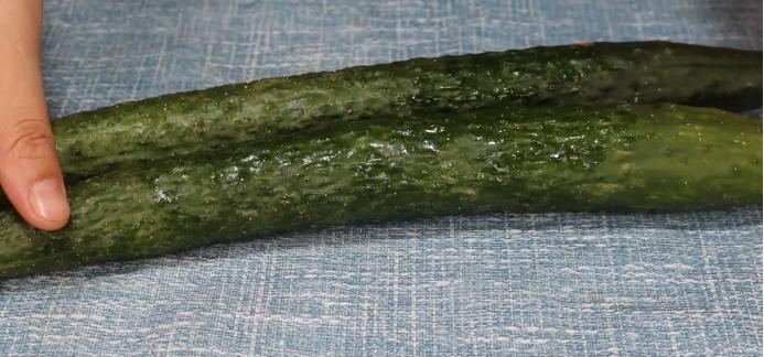 2、先把咱们准备好的黄瓜取出来,将准备好的黄瓜放到清水中先浸泡一下,浸泡完成之后咱们再将其清洗干净。一定要多清洗几遍,因为咱们的黄瓜皮也是要用的,所以咱们多清洗几遍,吃起来也又放心。黄瓜彻底清洗干净了之后将其取出控干表面的水分,然后把它放到案板上。