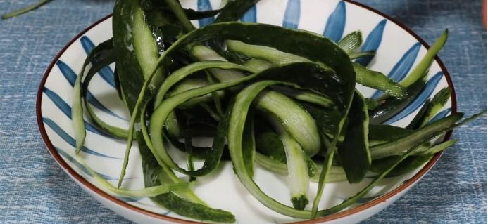3、接下来取出削皮刀,用削皮刀将黄瓜的外皮全部削下来。很多朋友有吃黄瓜削皮的习惯,而且削下来的黄瓜皮都是直接丢掉,但是这样的做法会造成很大的浪费,因为黄瓜皮里面含有的营养成分也是丰富的。所以以后咱们在吃黄瓜的时候,好不要将黄瓜的外皮削掉了。