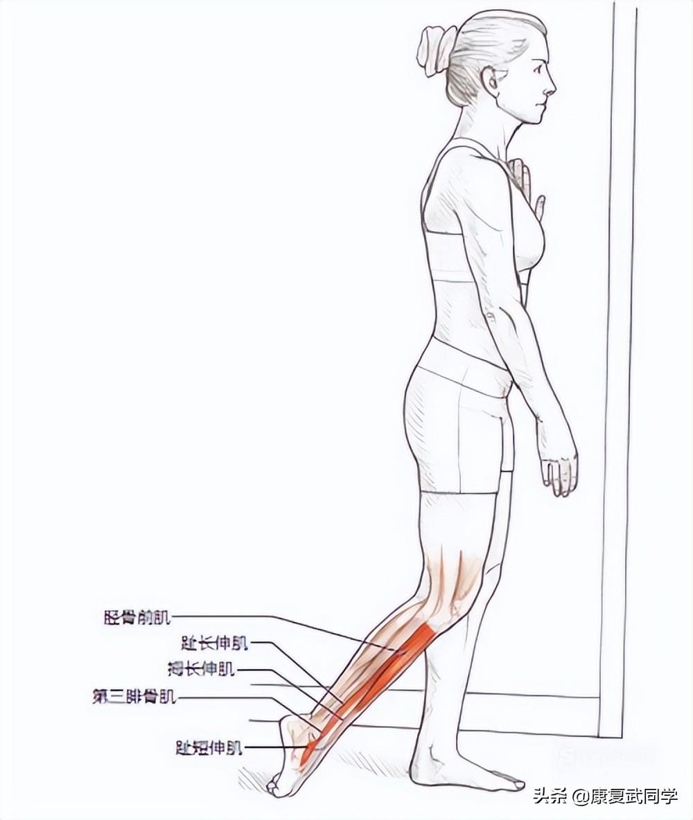 站姿趾伸肌拉伸:站立,以一面墙或物体作为支撑来保持平衡。将右脚伸向身后,脚趾背部触地。将脚背放在枕头或毛巾上,会使此拉伸更舒适。保持脚背压在地面上,将身体重量放在右腿上,朝地面下压脚跟底部。对另一条腿重复此拉伸。