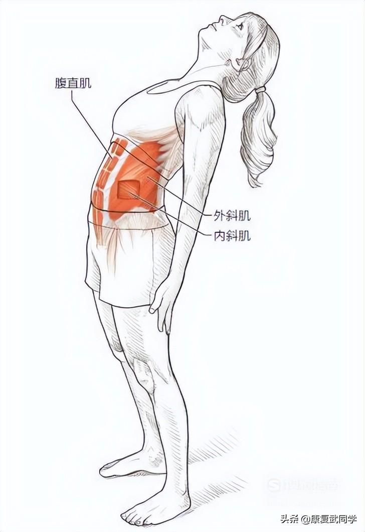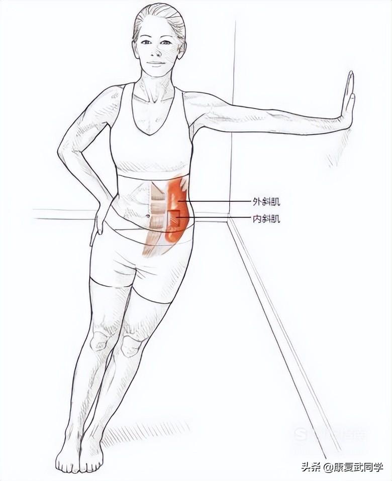 躯干下部侧屈肌拉伸:站立,双足并拢,身体左侧面向一面墙,离墙约一臂距离。将左手手掌放在墙上与肩等高的位置。将右手掌跟放在髋关节上。保持双腿伸直,收缩臀部,朝墙的方向轻微地旋转髋部,用右手朝墙的方向推右髋部。对另一侧重复相同步骤。
