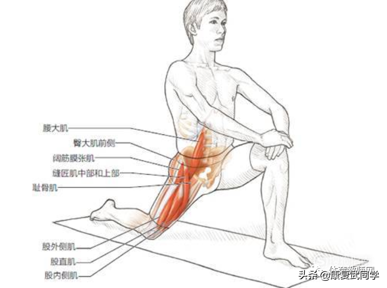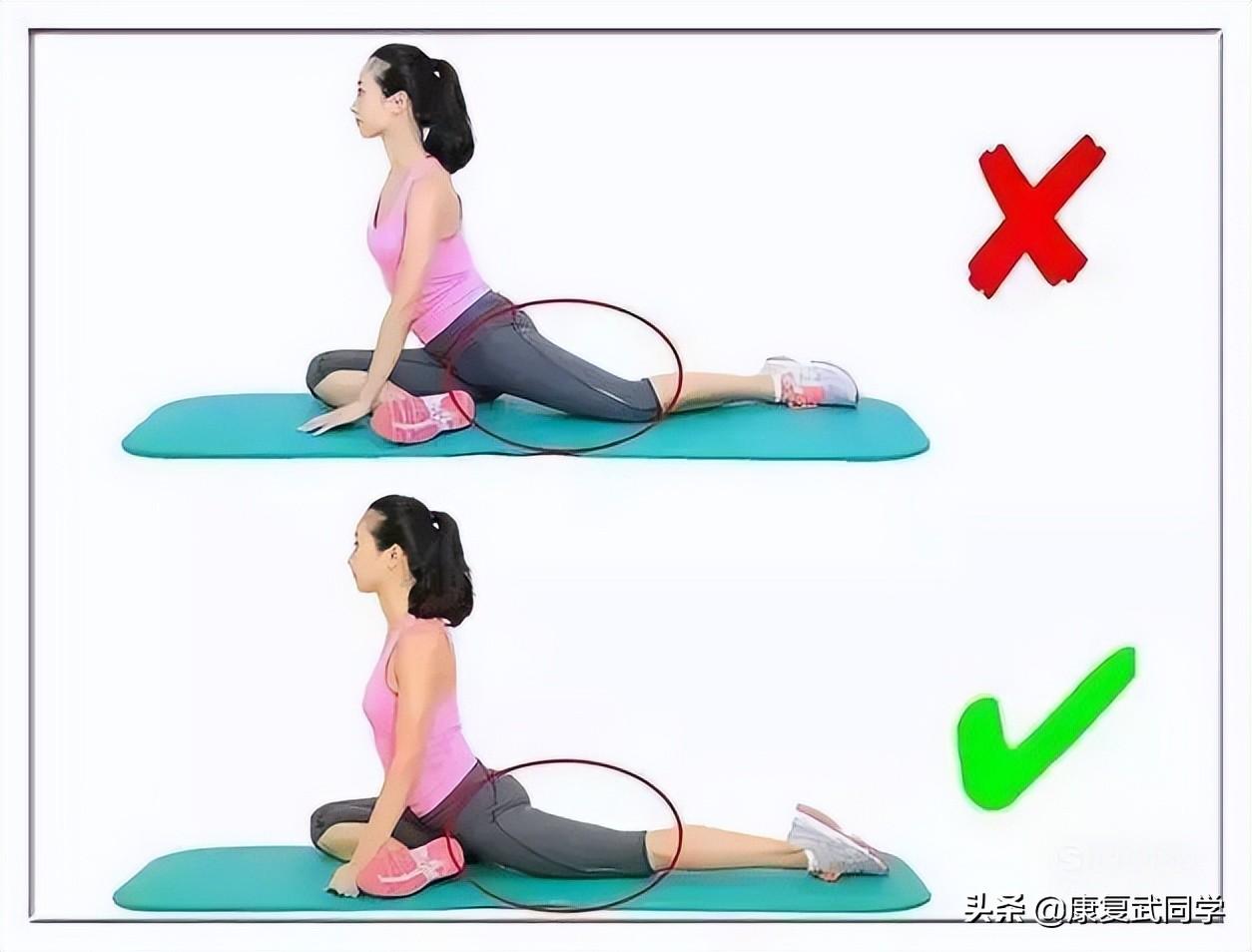 髂腰肌拉伸2:这个动作还对大腿前侧肌有拉伸的果,注意,膝盖一定一定要朝下,整个大腿尽量向下贴紧地面。