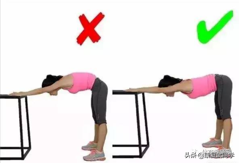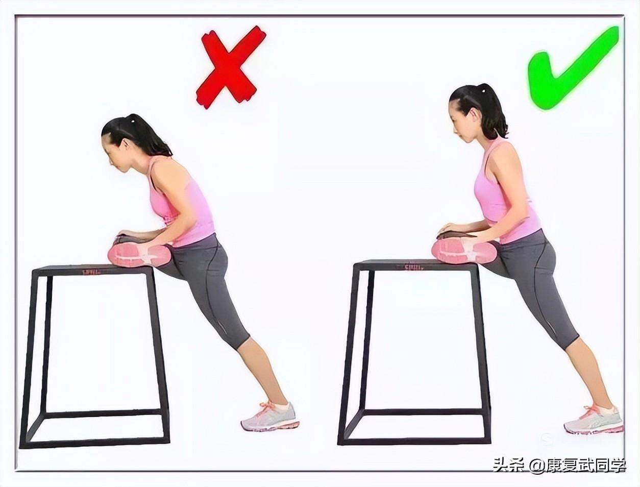 臀中肌拉伸:将脚距离借助物 20 厘米左右,脚趾向前,一只腿绷直,腰背一定要挺直。