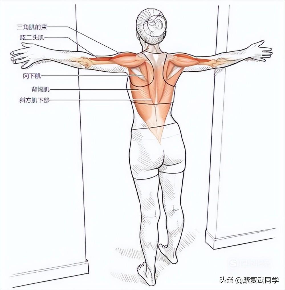 肩屈肌拉伸:面朝门口或墙角站立;双脚与肩同宽,一只脚比另一只稍微靠前;伸直双臂,将双臂抬升到与肩等高,将手掌放在墙上或门框上,拇指朝上;让整个身体前倾。