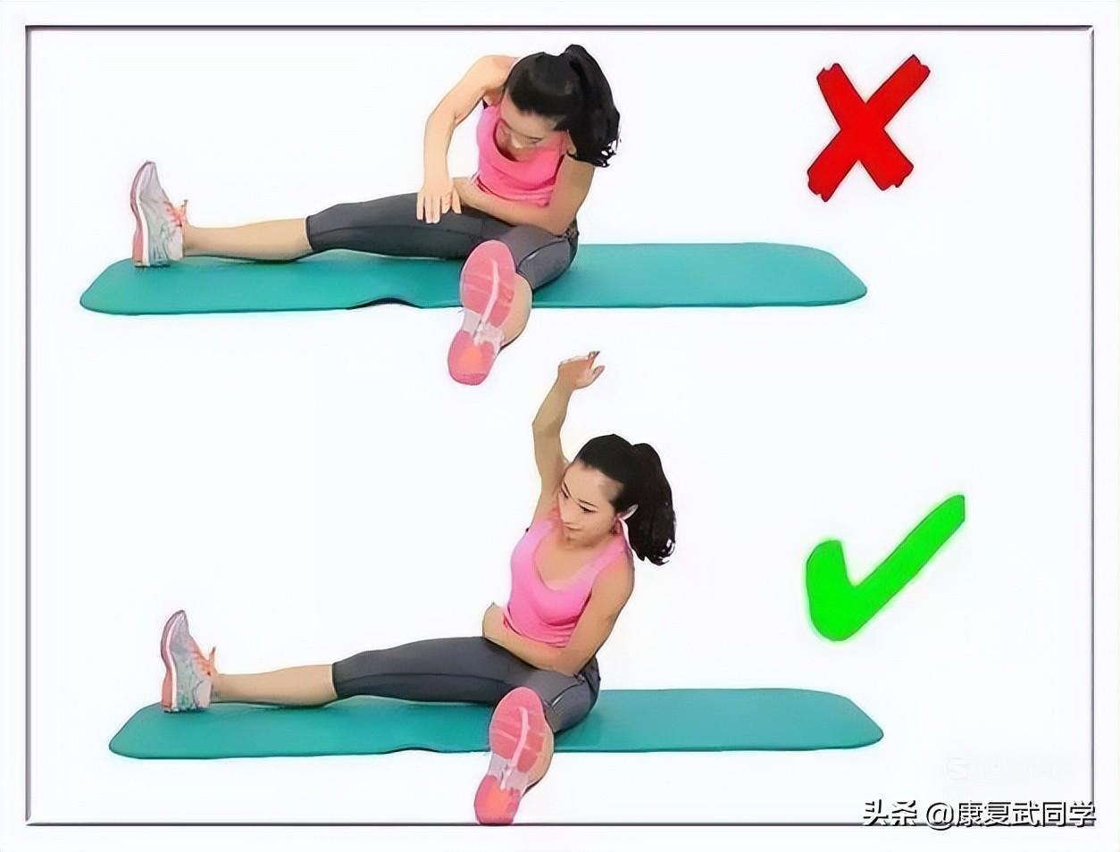 大腿后侧拉伸:这个动作要和侧腰区别开来,想要感觉到大腿后侧肌群的强烈酸痛感,你不能弯腰弓背。