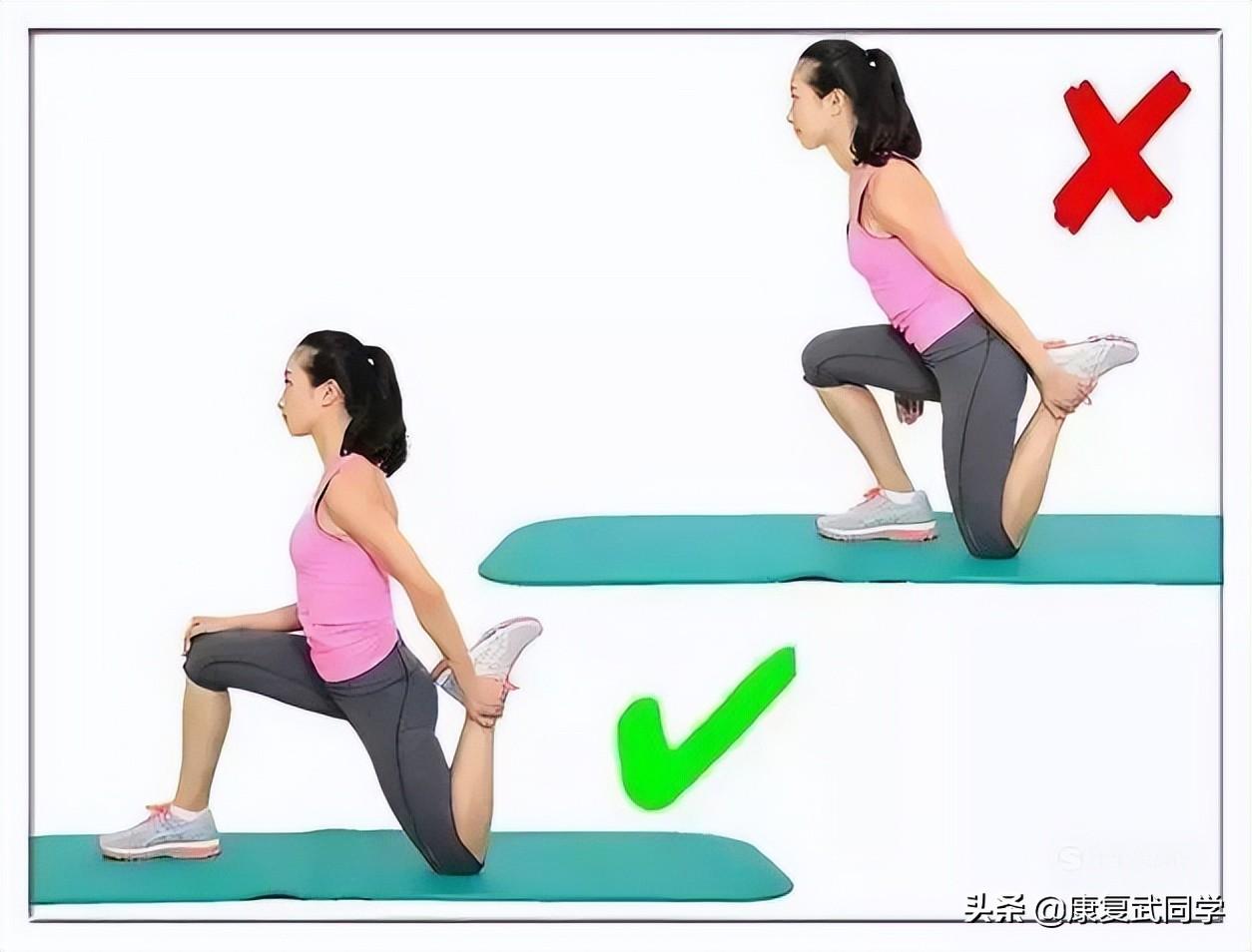 大腿前侧肌群的拉伸:上身不要前倾,膝盖不要超过你的脚尖。