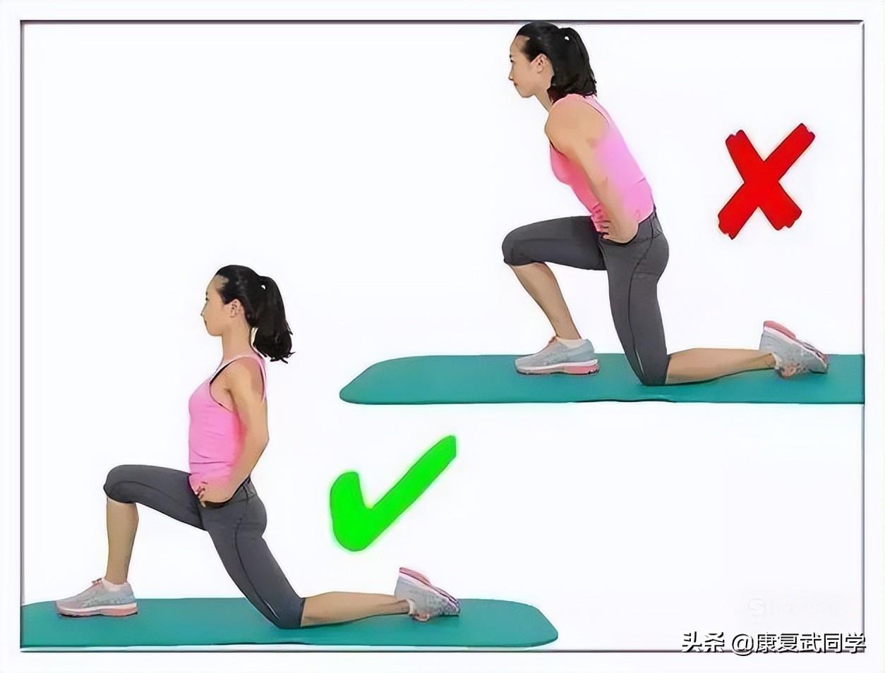 髂腰肌拉伸1:膝盖不要超过自己的脚尖,腰背挺直,弓箭步一定要大。