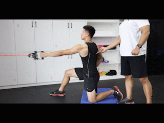 动作要领:单腿跪在垫子上,背部挺直,后脚前脚掌抓地,臀部收紧,背部垂直于地面。双手紧握弹力绳直线向后拉。