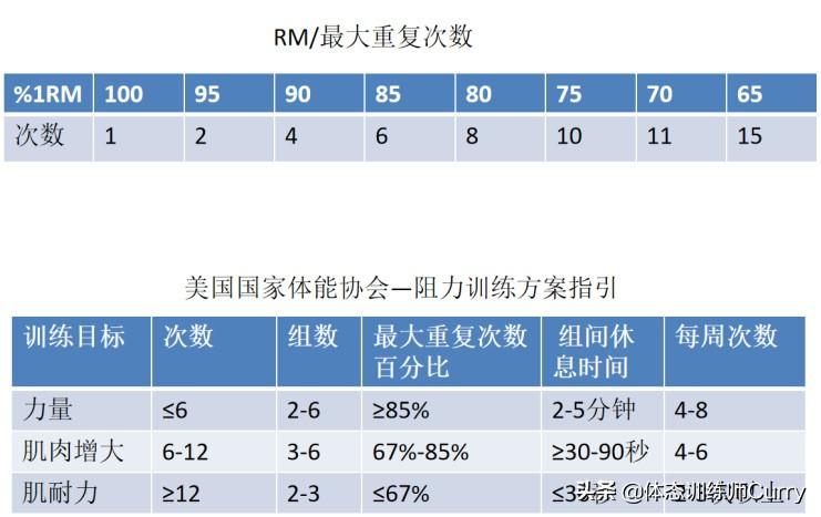 RM值为肌肉在一定范围内一次收缩所能克服的大重量,根据下面的表,我们可以对应找到适合自己训练强度。