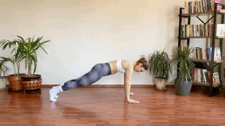 保持在斜板式的准备姿势呼气收紧核心,臀部向上双脚向上滑动到下犬式吸气,双腿向后还原斜板式动态练习10-12次动作4