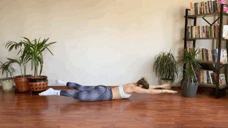 俯卧在垫面上,双手向前伸直核心、臀肌收紧,呼气,双手双腿离地吸气还原,动态练习12-15次Tips:练习完以上动作可以回到婴儿式休息放松调整一下噢!