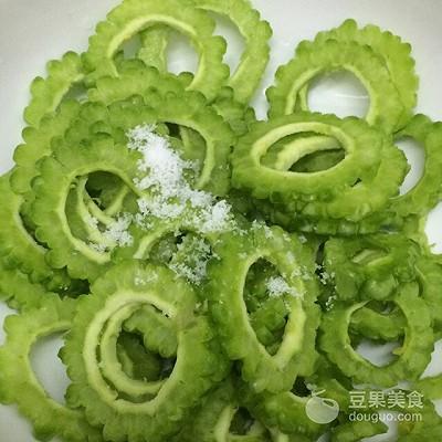5、将切好的苦瓜放入碗中,加入盐腌制三分钟