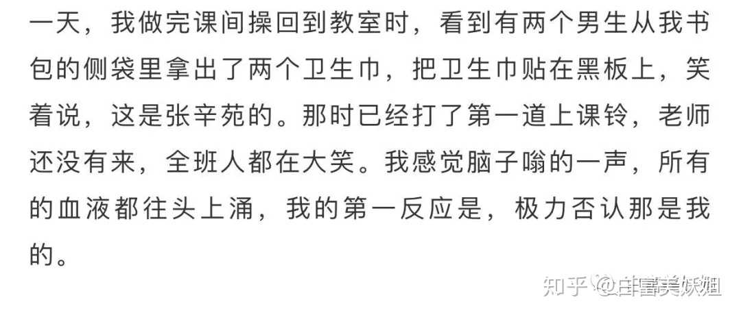 而在她离开初中很久之后,她也不再是那个“双肥”,却遭遇了和“贴卫生巾在黑板上”一样的羞辱。