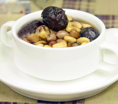 材料:花生100克、红枣去籽100克、黄豆100克。