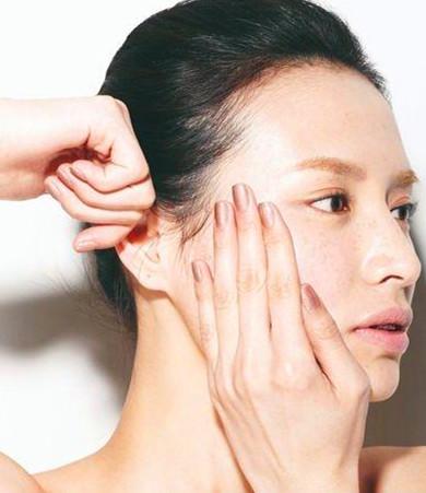 把耳朵提起来,就好像打开了淋巴循环的闸口,让淋巴循环更顺畅。用一只手向斜上方提起耳朵,另一只手按住脸颊并向耳朵方向推按。