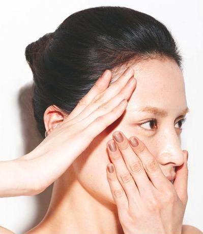 从额头的中央开始,双手手指向太阳穴方向进行推按,达到整个面部的排水功,注意后要重点按压太阳穴位置。