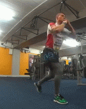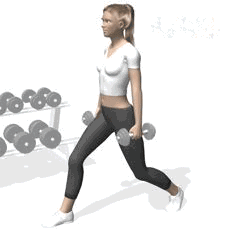 动作过程:当下蹲至低位置时,再使两腿同时向上伸直,左脚向前收回,并向右脚靠拢并立。然后,再使左脚向前跨出一大步下蹲。重复做。