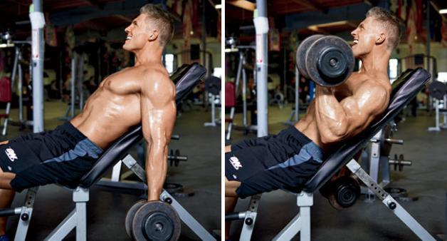 选择一个负重,可以在标准姿势下完成10个。坐在上斜凳上,倾斜度可以稍微调高。左右手各完成10个,然后站起来,进行锤式弯举,次数尽可能多。这个组至少完成4组,每个动作相同负重完成10个。我相信做第四组时已经很难了。