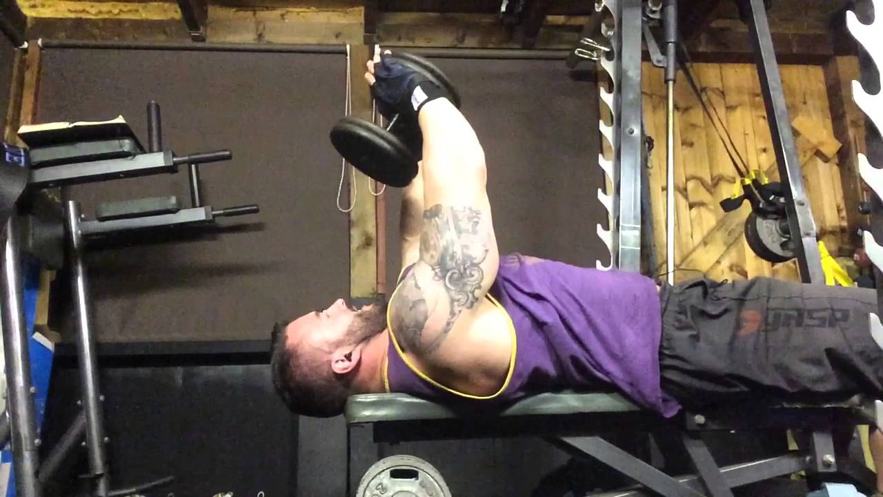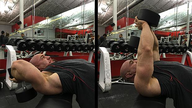 我相信没有其他训练三头的动作果能比这个要好了。当哑铃越过额头的时候,关键在于下放哑铃,通过伸展三头完成向心动作的行程。