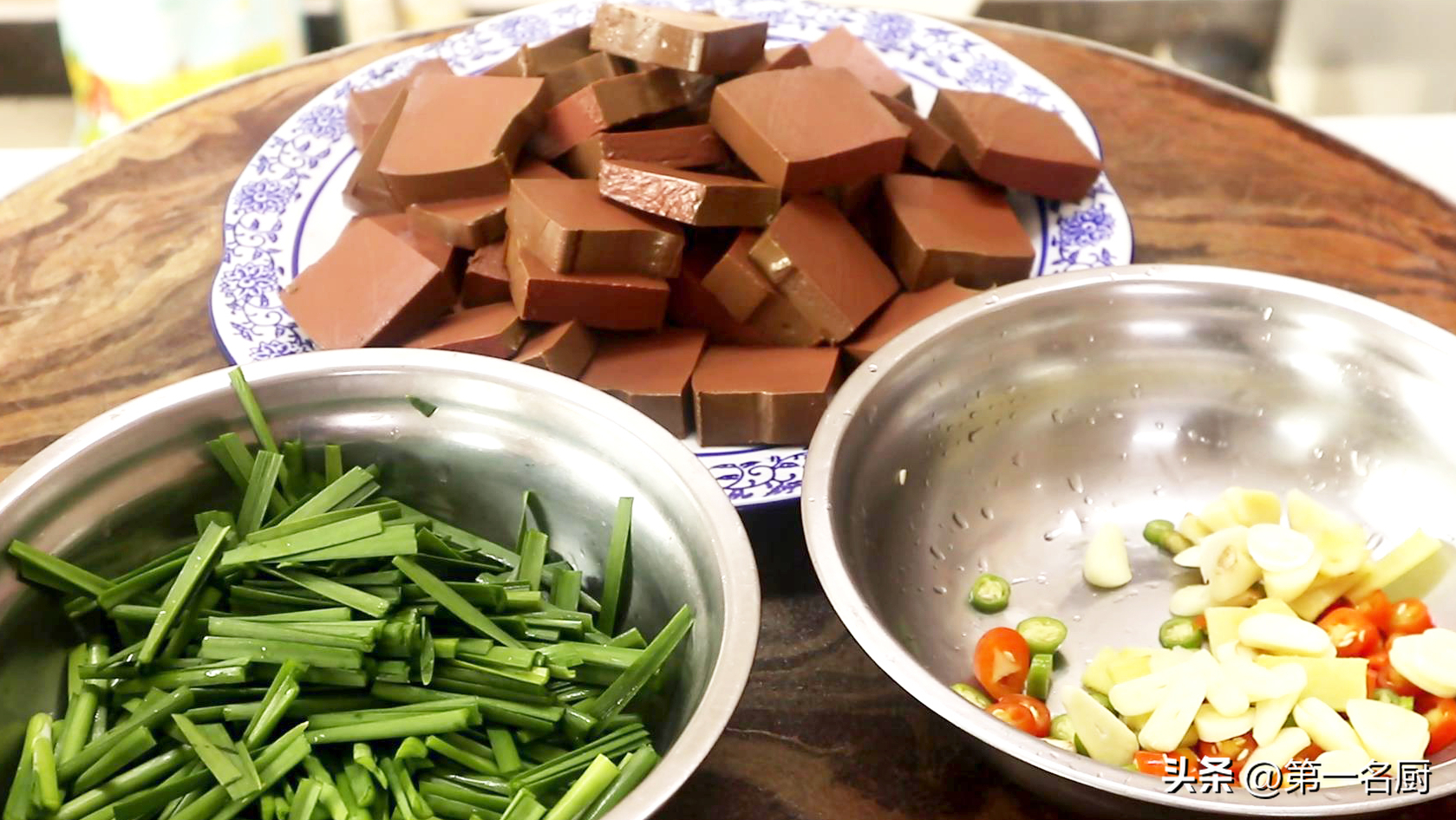 1.准备韭菜一把,洗净后切成3厘米长的段,鸭血两块切成厚片,青红辣椒各一个切成细圈,生姜一块切成姜片,大蒜几粒切成蒜片。
