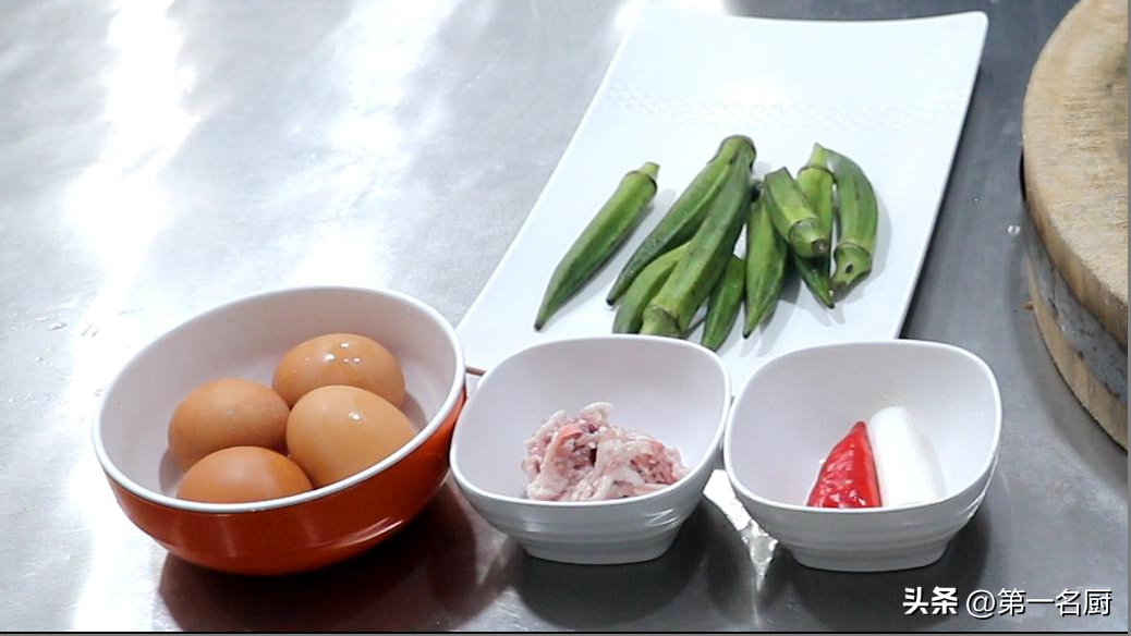 1,鸡蛋4个,秋葵一小把,首先把秋葵去掉头尾,再切成半厘米厚的薄片,放入盘中,肉馅适量备用,大葱一段切成葱花,红椒半个切碎,用来配色。