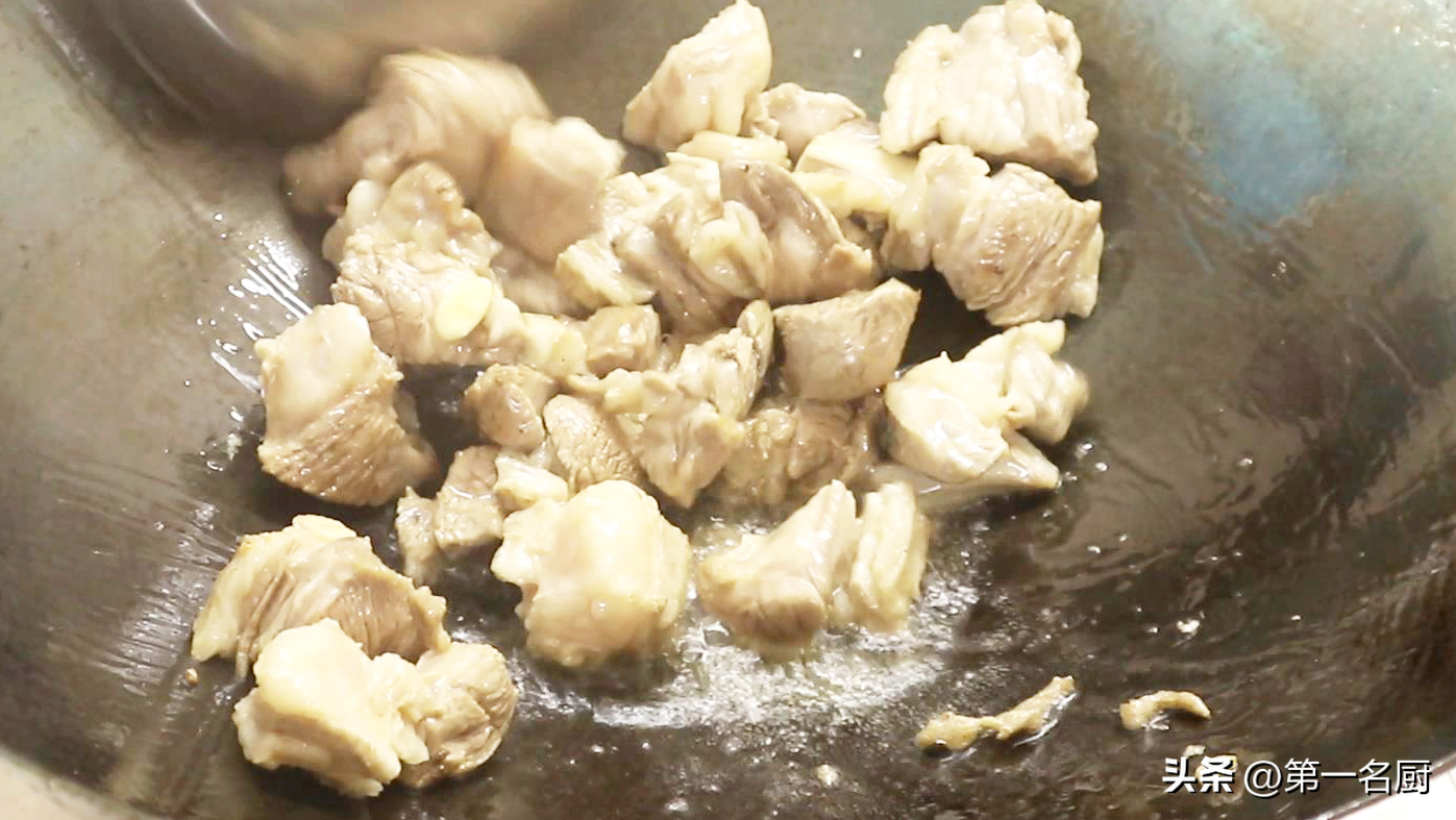 3.重新把锅烧热,加入一大勺食用油,先润一下锅,把锅滑好以后把油倒出,再加入少许凉油,倒入羊肉块慢慢地翻炒,炒干里面的水汽,这个过程大概要两分钟左右。