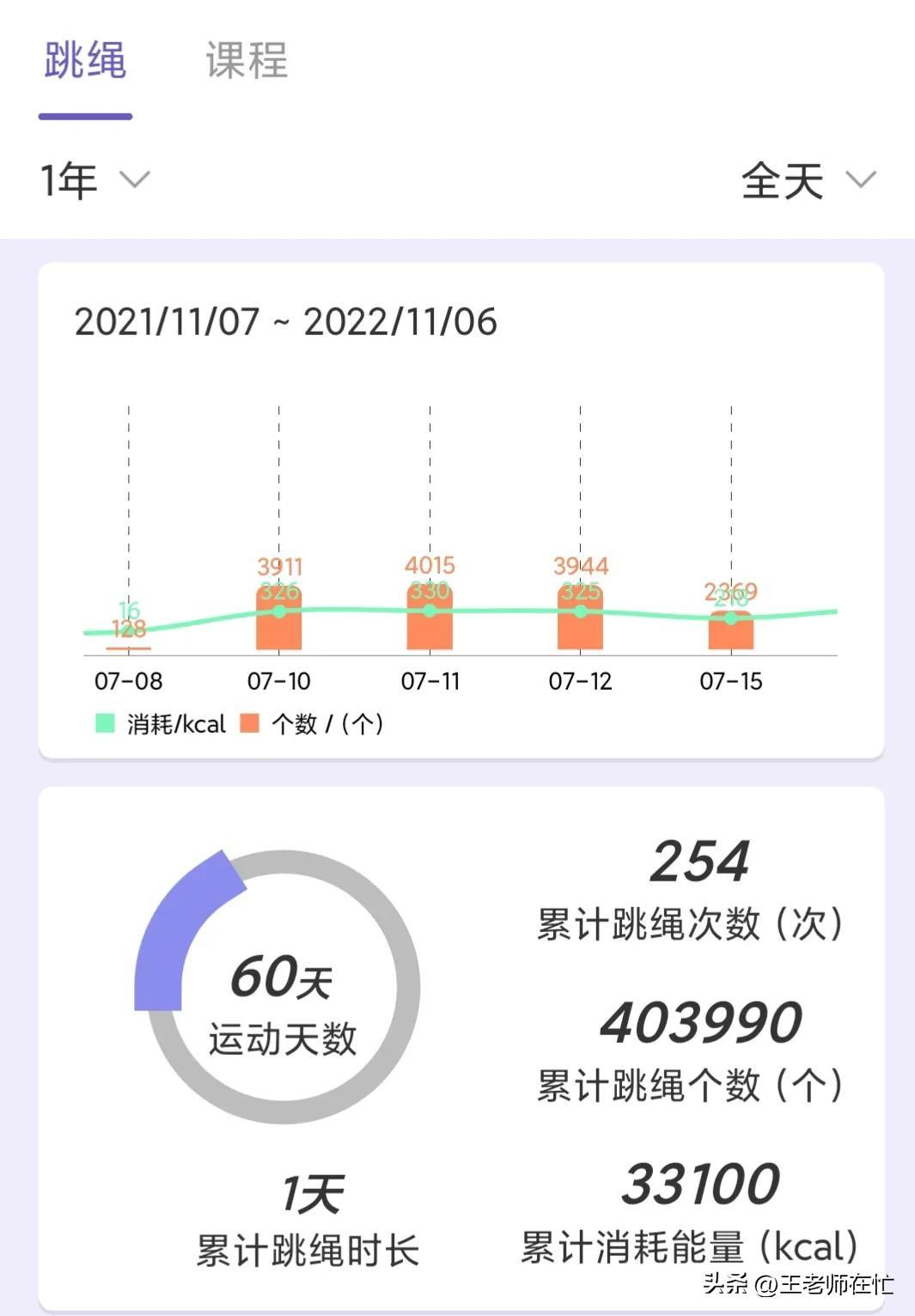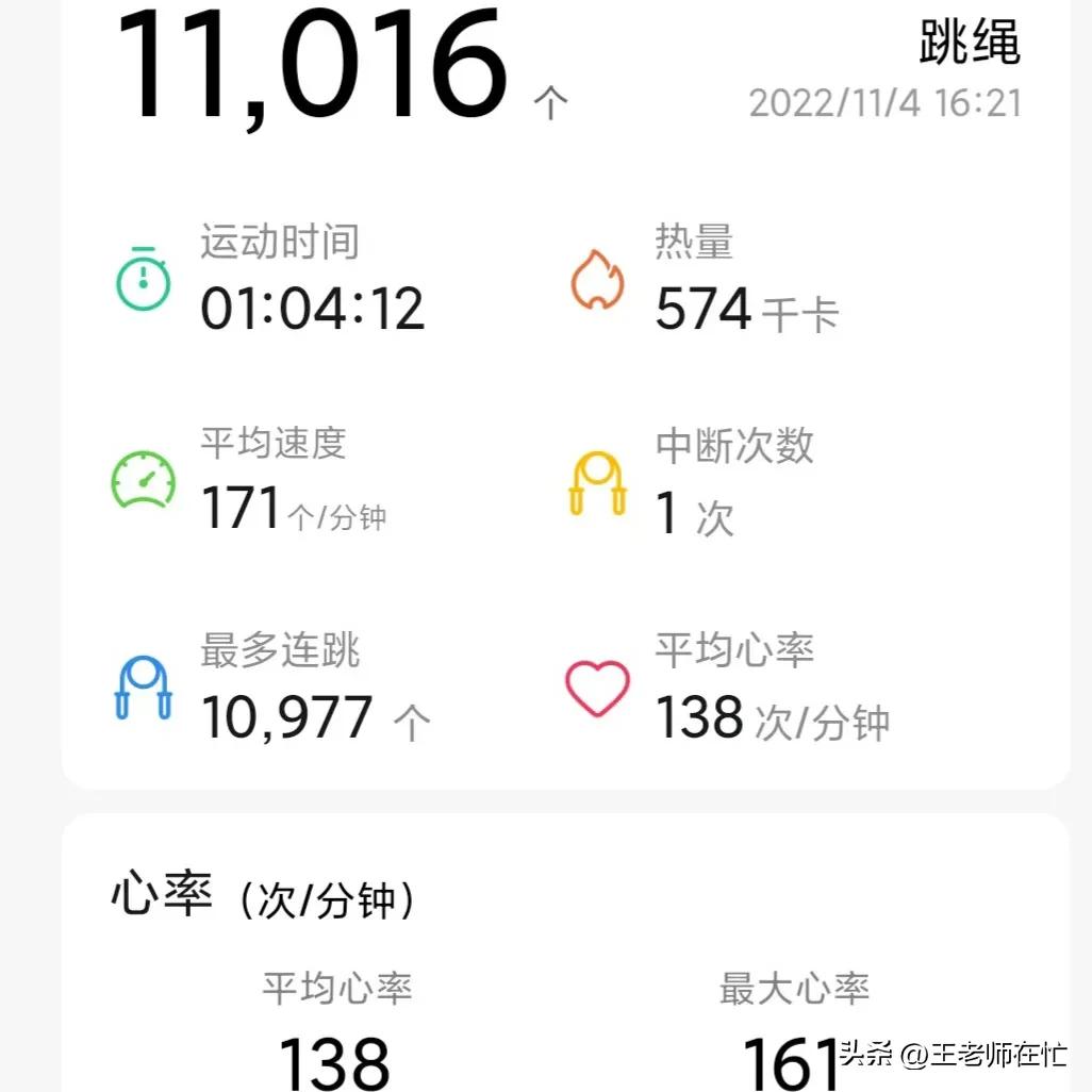 当时每天30分钟5000个左右是身体能够承受的极限,就这样在我不懈努力下坚持度过了酷暑难耐的夏天,2个月时间我的体重也有原来的145斤下降135斤,现在,拌绳率低基本每天跳绳1万个轻轻松松,连跳由1000个,2000个,3000个,我一直觉得连跳5000个不拌绳身体承受能力将近极限,就已经很牛了,现在体重128斤,熟人见了以后都说怎么这么瘦?怎么瘦下来的?都很惊讶。
