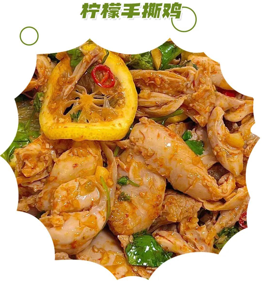 3、鸡腿肉➕香菜段➕柠檬片,淋上料汁,抓拌均匀即可。