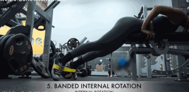 动作5,身体依靠在固定器械或者健身椅用弹力带完成臀部外展/外扩,这个动作高次数完成,每组做25 - 20次