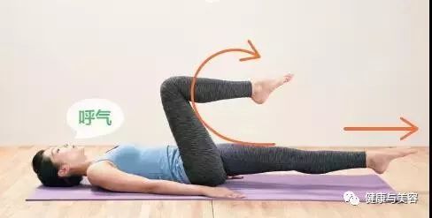 左膝慢慢伸展的同时,拉近右腿膝盖并深度弯曲髋关节。配合腿部伸展的动作呼气。慢慢反复进行5 次。腹部不用力时不会上抬并感觉疼痛时,需要注意。