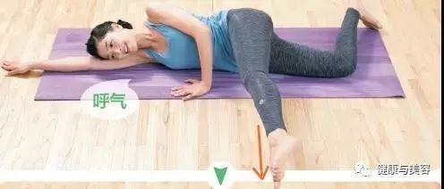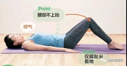 保持腹部紧绷并呼气,下放双腿,仅使脚趾尖着地。后背紧贴地面以腰部不上抬,进行时保持膝盖呈直角。本组进行5次。