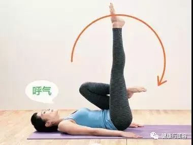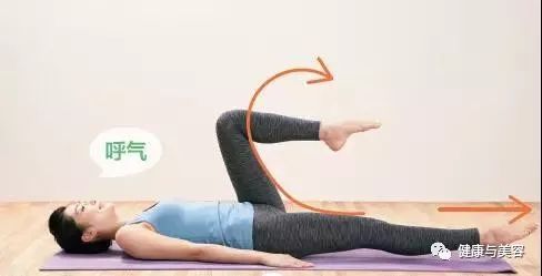 像大幅度慢慢蹬车一样,右腿弯曲贴近胸部,左腿向上伸展。腹部用力绷紧以避免腰部上抬,在腿部向上伸展时呼气。